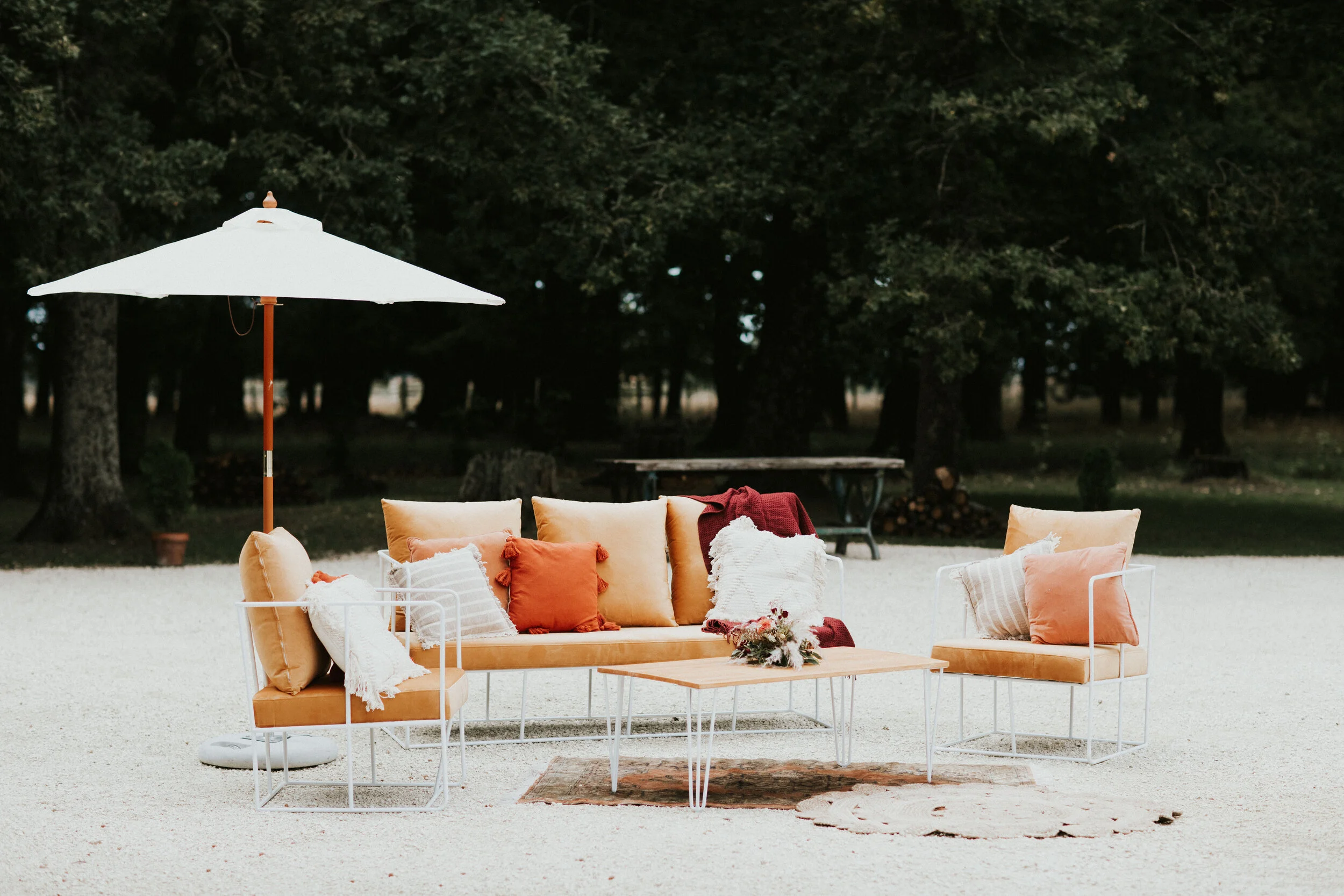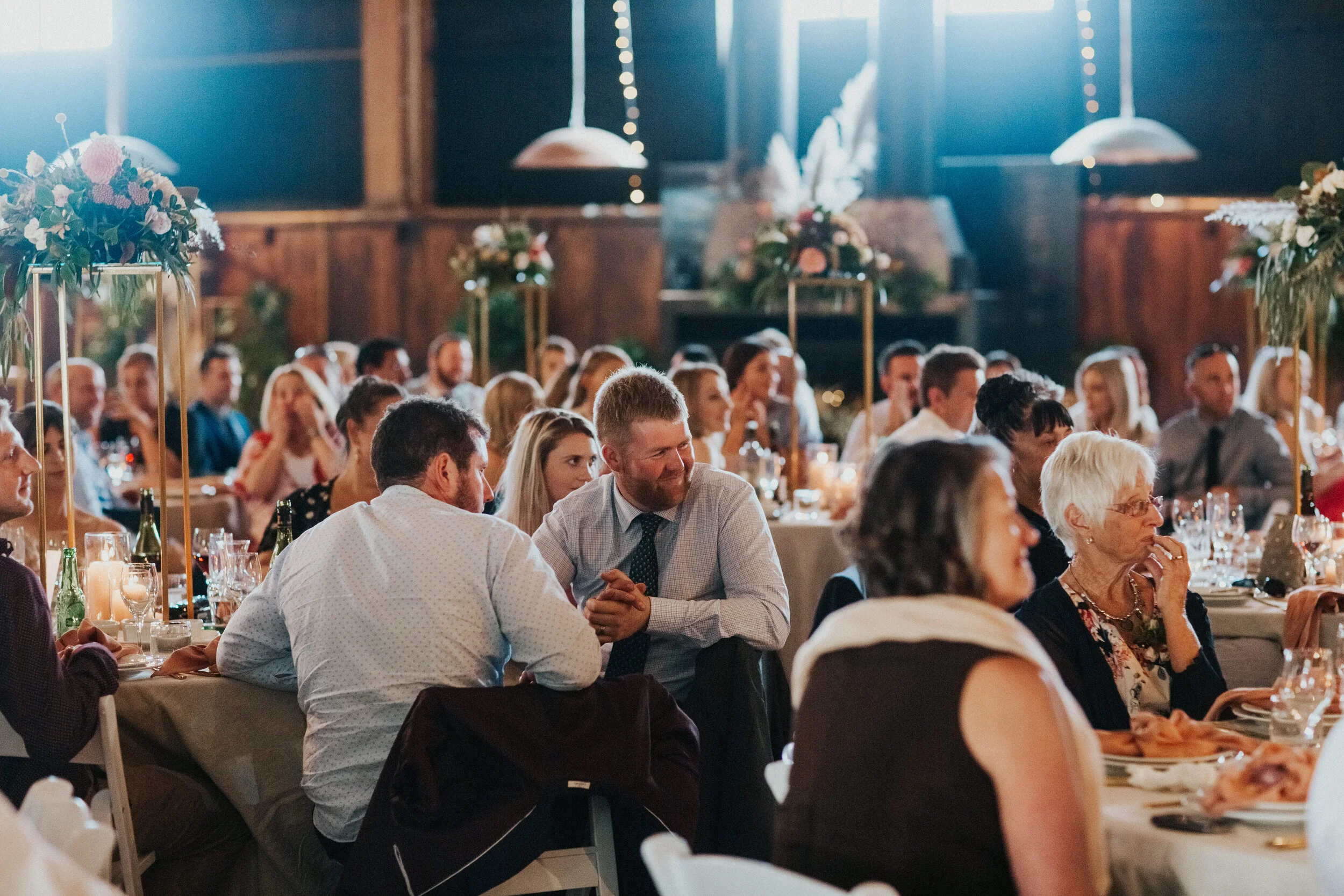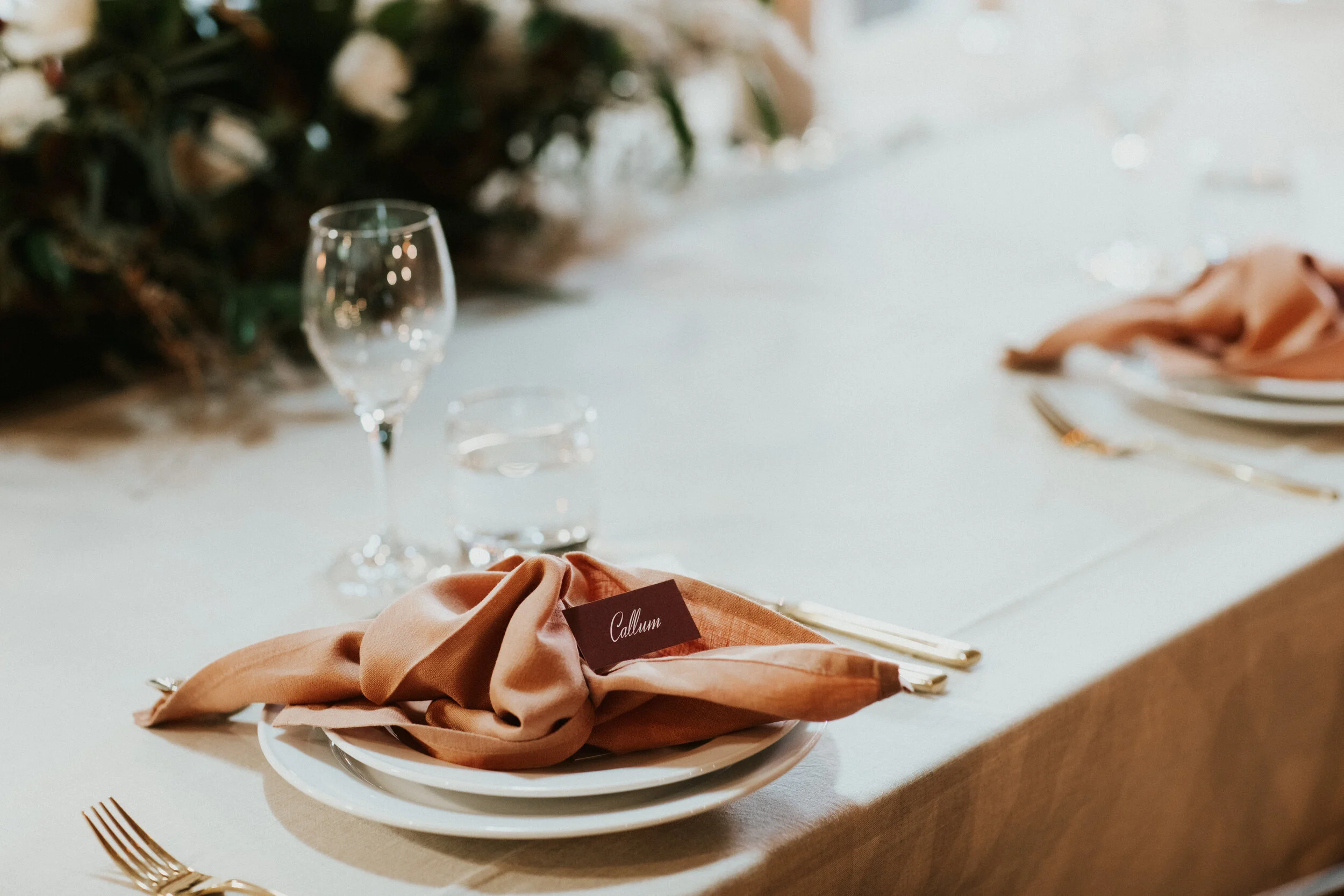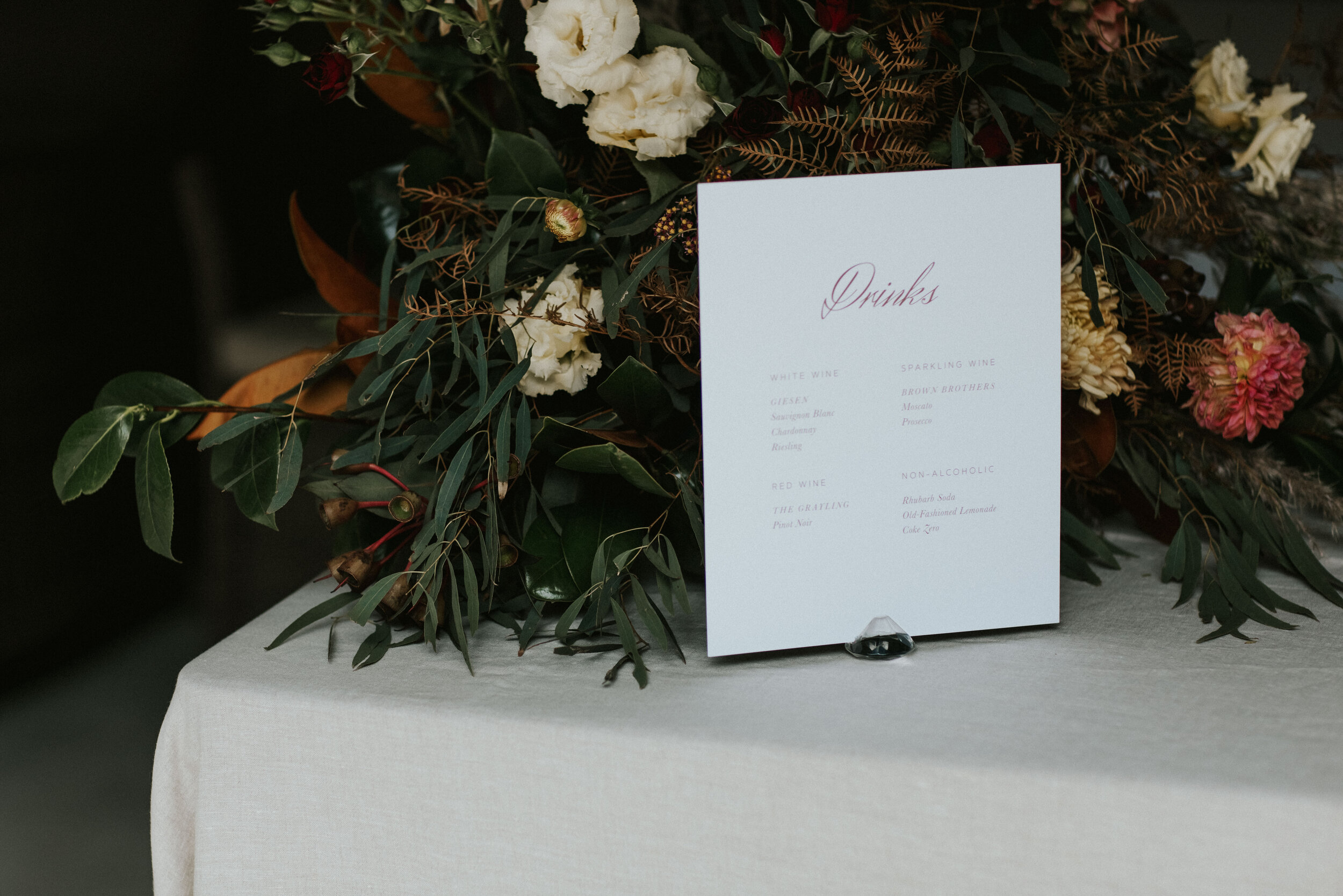 With the warm and opulent colour palette, this really complimented the venue’s wooden features and with florals topping high plinths made to essentiate the impressive height of the roof. With luxe French linen tablecloths and napkins, gold cutlery and pillar candles in cylinderical glass vases - every detail was thought of carefully. Stationery always finishes off a place setting, and we loved working with Kim from Smitten in Love for her effortless stationery options, She is also so accomodating making colour changes for us so we can make sure our overall styling is cohesive in all that we do.
